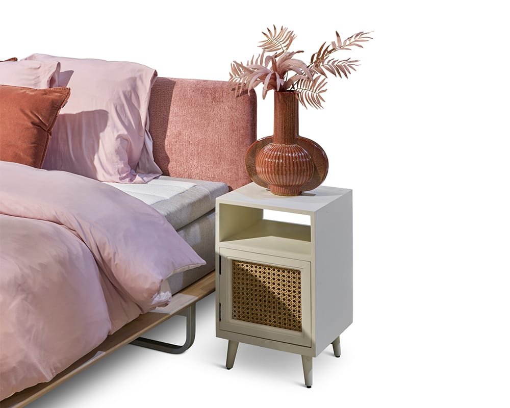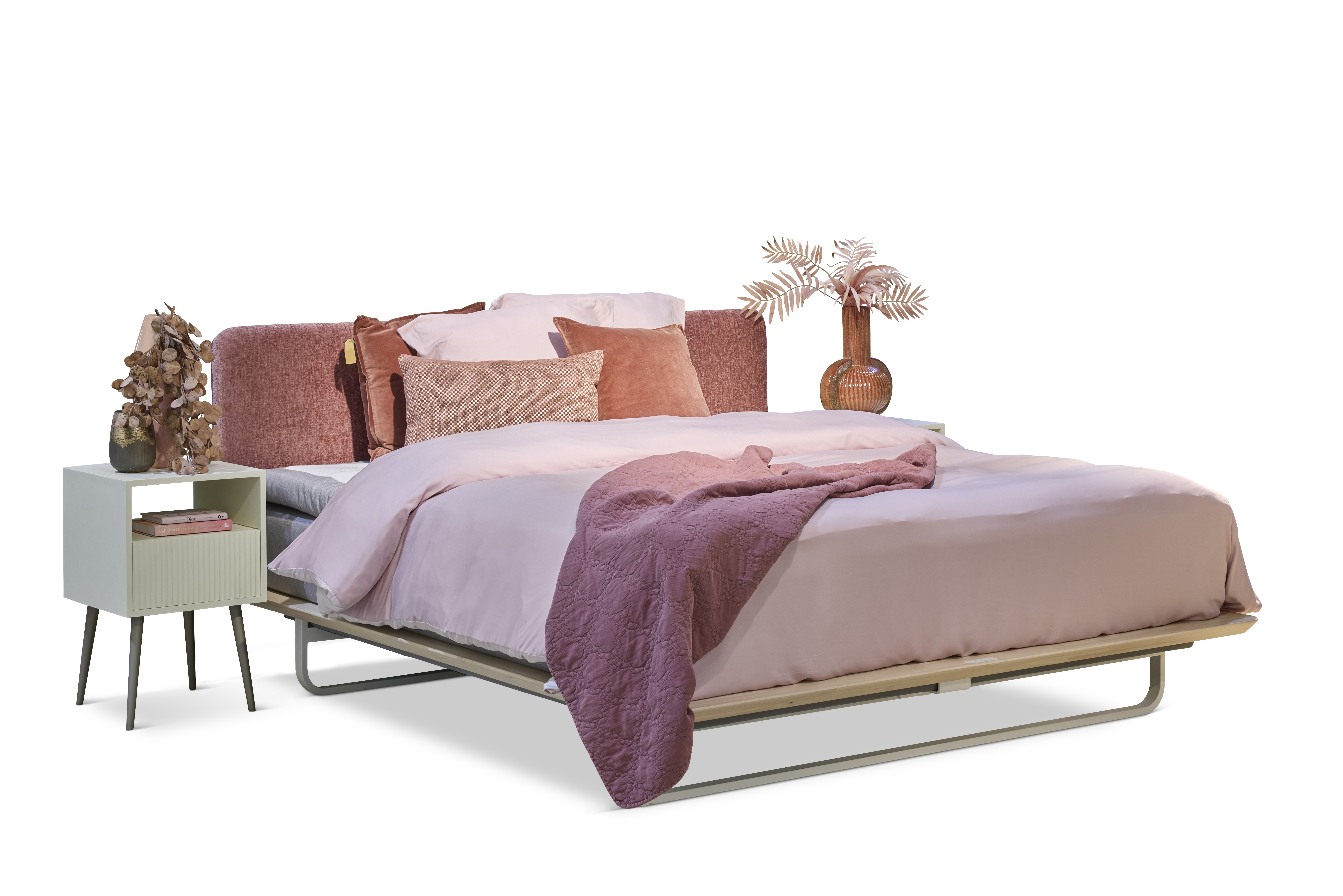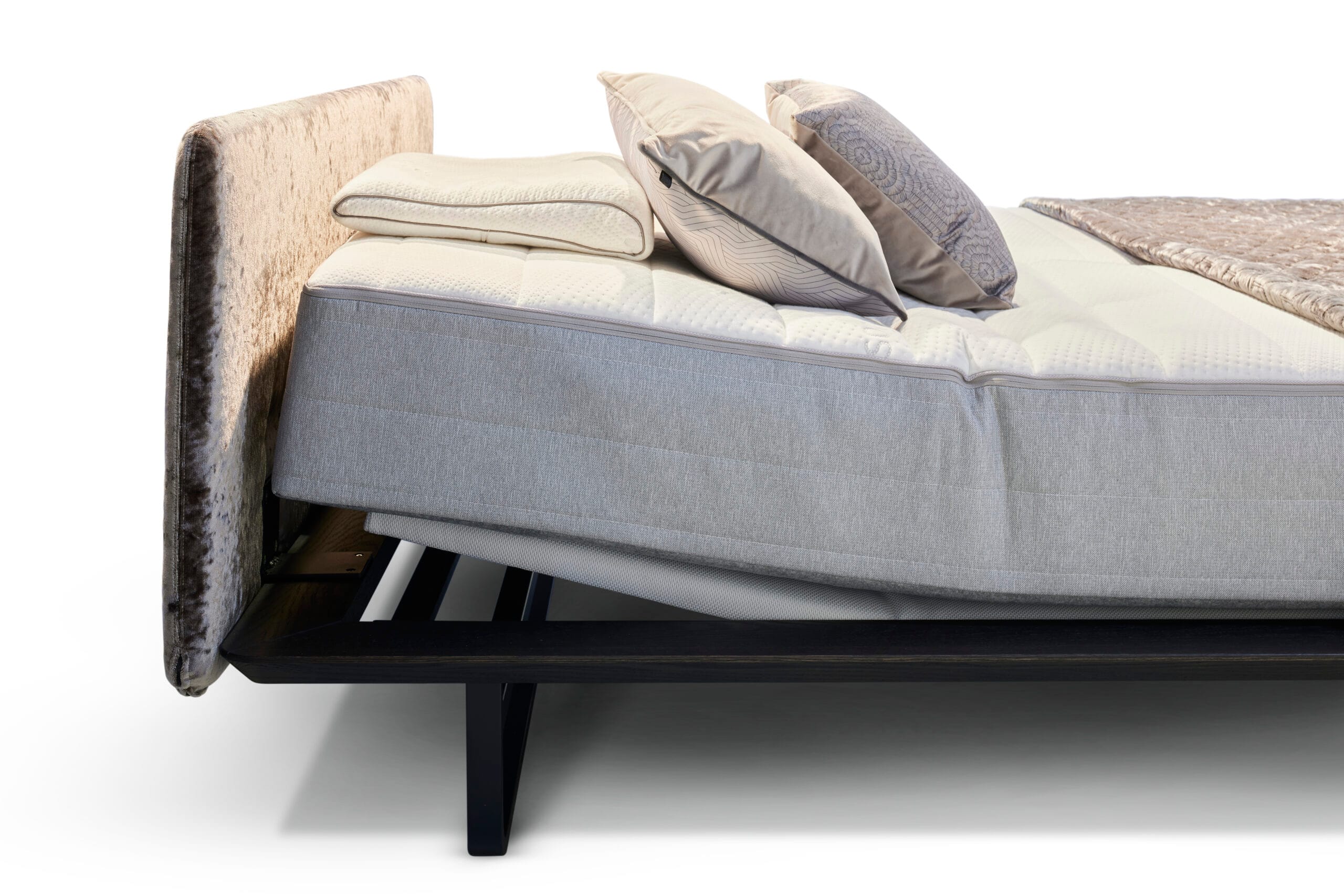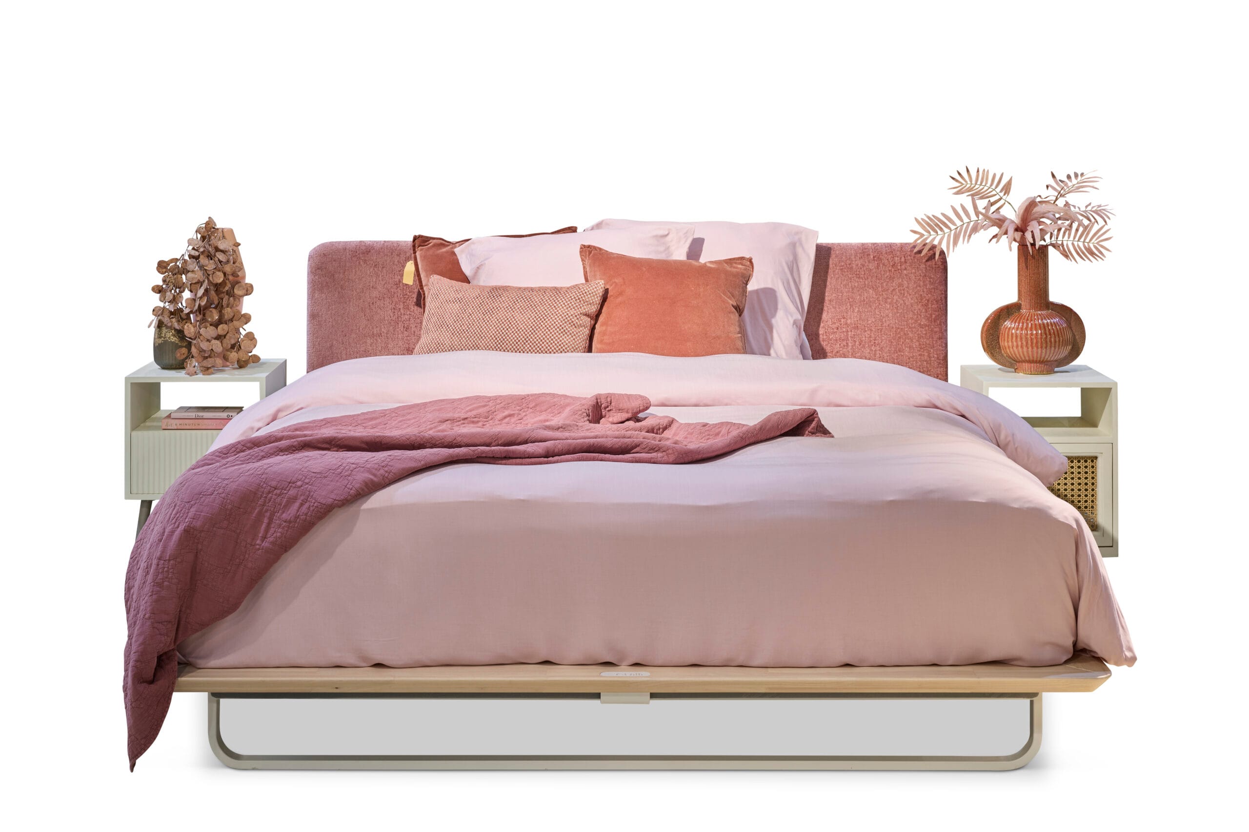 Je kunt kiezen voor een vlak model of een elektrisch verstelbare uitvoering, en het combineren met een massief houten hoofdbord of een gestoffeerd exemplaar in een van de 74 zorgvuldig geselecteerde stoffen. De optionele zwevende, draaiende Less-nachttafeltjes voegen niet alleen een stijlvol accent toe, maar zijn ook bijzonder praktisch in gebruik.